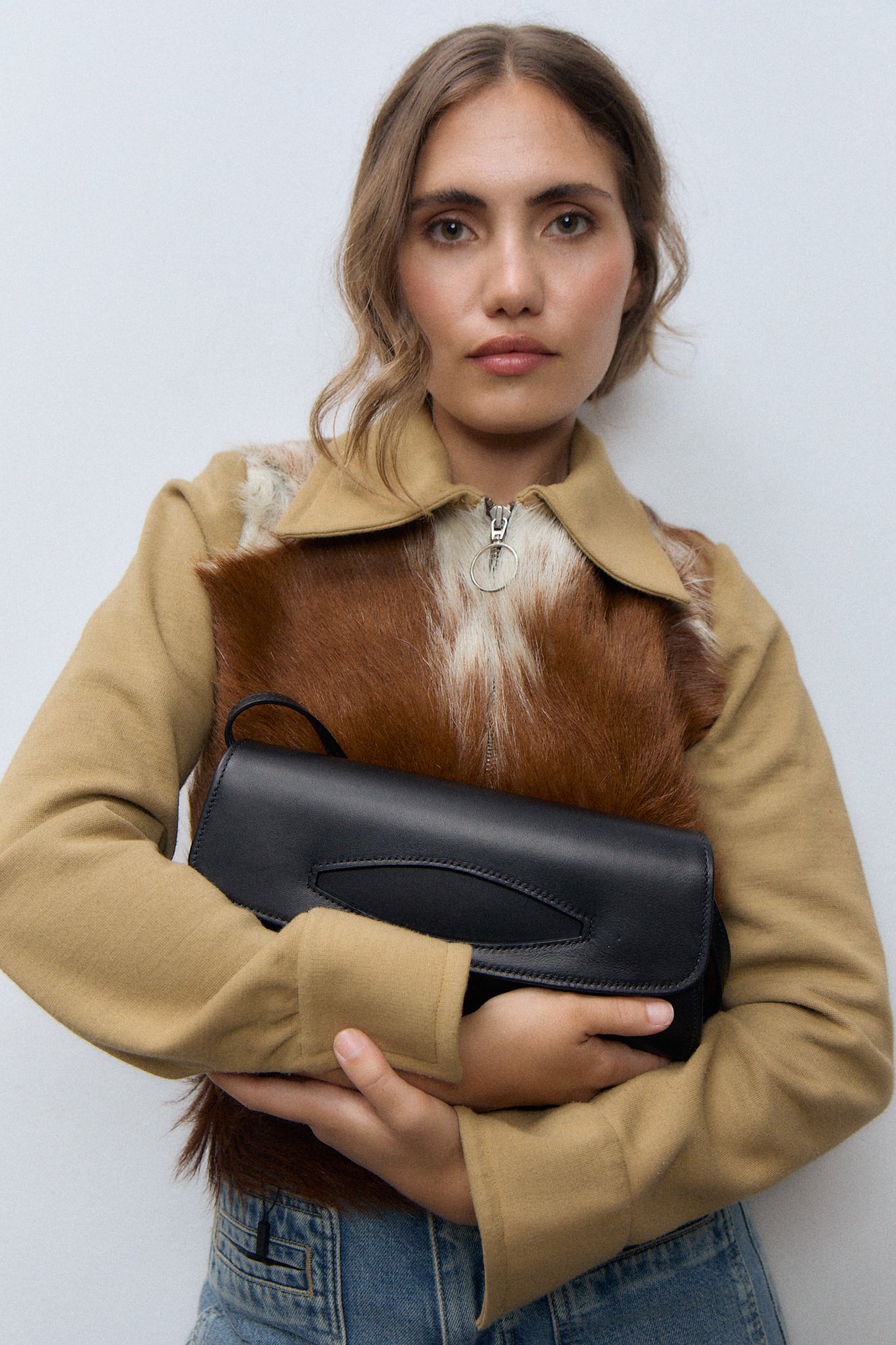 Crafted entirely from high-quality lamb leather, this handbag features a clean, curved silhouette that balances minimalism with subtle architectural detail. Its compact shape offers enough space for essentials, merging softness with structure in a refined design. A versatile piece that elevates evening looks with effortless sophistication. Handmade in Spain.